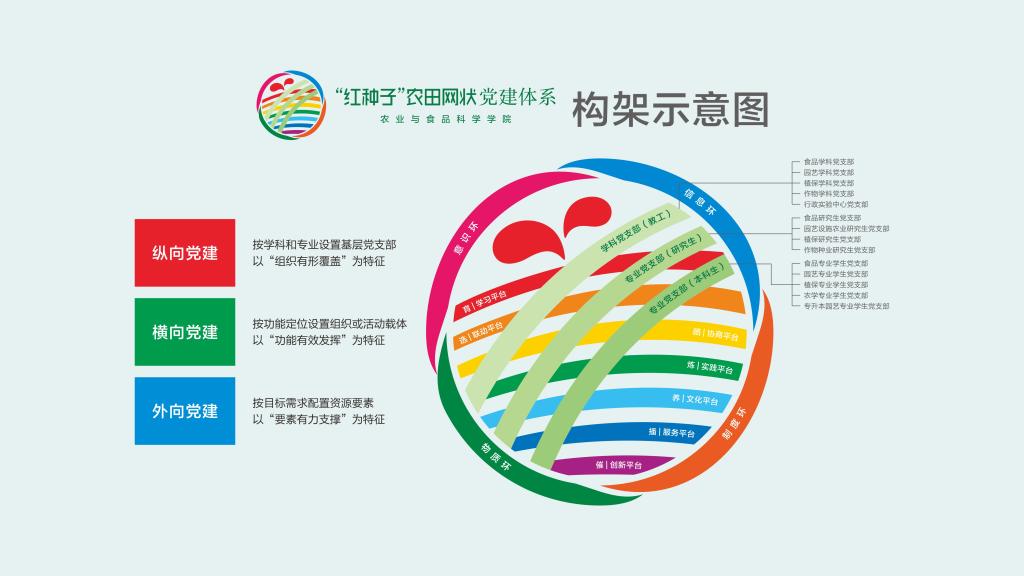 “红种子”农田网状党建工作是在巩固学院原有按学科和专业设置基层党支部基础上,构建以“组织有形覆盖”为特征“纵向党建”、以“功能有效发挥”为特征“横向党建”和“要素有力支撑”为特征“外向党建”的“三横四环七纵”农田网状“党建责任田”,通过“育、选、晒、炼、养、播、催”七个环节,按照“顶层化设计、品牌化建设、项目化运作、融合化发展”精心培育党员“红种子”(指有坚定的理想信念、较高的政治素养和较强的组织纪律,具有奉献精神、开拓精神、担当精神的共产党员),使每位党员“红种子”能在党建“责任田”中“扎根发芽、茁壮成长、枝繁叶茂、开花结果”,推动学院党组织的设置方式、平台载体、活动形式从单一、封闭、松散向多样、开放、融合的转化,解决学院党员的岗位履职、引领示范、作用发挥从缺位、被动、隐性向到位、主动、显性的转变,做到党建工作守土有责、守土负责、守土尽责,努力使学院党建工作更加体现时代性、把握规律性、富于创造性,服务学院高标准、高水平、高质量发展。